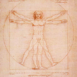 元気に手足を伸ばしているのは、当研究会のマスコット・キャラクター「コリント少女」です。コリント式オーダーを模した水着デザインに注目! さて、この構図は、「We love Vitruvius !」の文字が示唆しているように、通称「ウィトルーウィウス的身体」と呼ばれる伝統的な図像を、建築少女研究会風にアレンジしたものです。 両手足を伸ばした身体が、正方形もしくは円形に内接する、というウィトルーウィウス『建築論』の記述は、ルネサンス期以降、建築&絵画&彫刻の世界に、甚大な影響をおよぼすことになります。 神の似姿たる人間身体に刻み込まれた「神聖比例」を剔抉しようと、建築家たちの探求が、ここにはじまるのです。それは、建築に少女の姿を剔抉しようとする、当研究会の試みにも通じる探求ではありました。